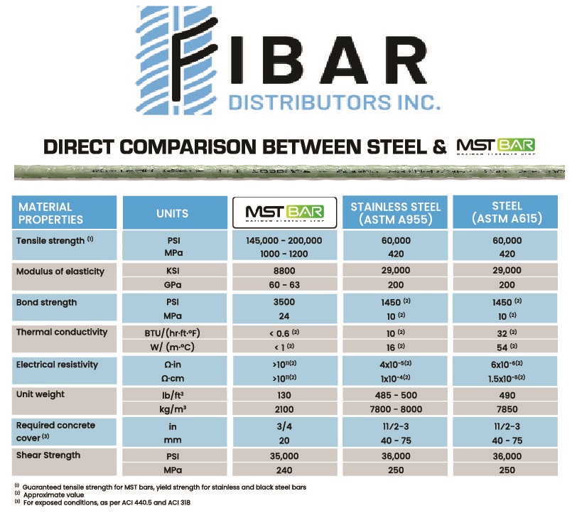 Fibar Distributors Inc. proudly distributes MST-BAR; a Glass Fiber Reinforced Polymer (GFRP) Rebar, the future of concrete reinforcing.
